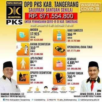 Sekretaris Umum DPD PKS Kabupaten Tangerang Ahmad Syahril mengungkapkan, sebelumnya DPD PKS Kabupaten Tangerang melakukan aksi sosial seperti semprot cairan desinfektan, pembagian masker dan Hand sanitizer. Tak hanya itu, PKS juga membagikan paket sembako dan APD untuk tenaga medis, dan lain-lain.