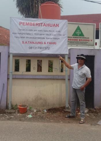 CIKUPA, (JT) - Salah satu warga RT 05 /3 Desa Bojong, Kecamatan Cikupa, Kabupaten Tangerang, Banten, menggugat kepemilikalahan yang kini ditempati SDN Bojong V. Ahliwaris juga memasang papan pemberitahuan yang berisi lahan seluas 1.790 meter persegi itu milik Satra Bin H Ja'ah.