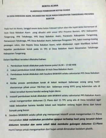 Untuk diketahui, pada Kamis 16 April dilakukan rapat klarifikasi di Aula kantor Desa Babakan Asem Kecamatan Teluknaga, pertemuan tersebut dihadiri unsur penyelenggara Pilkada diantaranya adalah antara KPU Provinsi Banten, KPU Kabupaten Tangerang, Panwas Kabupaten dan Kecamatan Teluknaga, serta PPL dan pengawas TPS.
