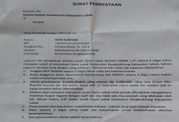 RANGKASBITUNG - Karena kesal dengan kinerja atasannya, Sekretaris Kelurahan Cijoro Lebak, Neni Suryani melaporkan Ikhsan Hakim yang merupakan Lurah Cijoro Lebak, Kecamatan Rangkasbitung, ke Inspektorat. Dalam laporan itu disebutkan terkait beberapa prilaku kurang baik dari atasannya tersebut.