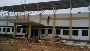 Berdasarkan pantauan di lapangan, nampak pekerja proyek pembangunan stadion mini Kecamatan Teluknaga tengah sibuk melakukan pekerjaan pemasangan bagian atap, pada bagian depan stadion mini, pekerja bangunan sedang makukan pekerjaan plester pada bagian tembok. (day)
