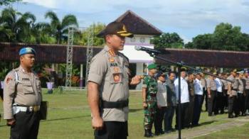TIGARAKSA - Tim Gabungan Polisi Resort Kota Tangerang melakukan Apel Pasukan Operasi Mantap Brata di Lapangan Maulana Yudha, Kecamatan Tigaraksa, Kabupaten Tangerang, Jum'at (22/3/2019). Apel tersebut diikuti oleh Kepolisian, TNI, Ormas, dan Instansi terkait lainnya. Dalam kesempatan tersebut, Kapolresta Tangerang, Kombes Pol Sabilul Alif membacakan amanat dari Menteri Koordinator Polisi, Hukum, dan HAM (Menkopolhukam) yang menyatakan bahwa kesuksesan pemilu pada 17 April 2019 mendatang merupakan tanggungjawab semua pihak.