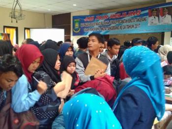 TANGERANG - Lautan manusia terhampar di aula Kecamatan Priuk, Kota Tangerang pada Kamis (9/2/2017). Mereka berduyun - duyun ke lokasi tersebut guna mengikuti job fair yang diselenggarakan Pemerintahan Kota Tangerang.
