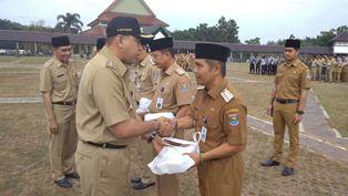 TIGARAKSA - Bupati Tangerang A. Zaki Iskandar gelar Apel awal Januari 2018. Dalam kesempatan kali ini, Bupati memberikan secara simbolis e-KTP kepada para Camat Se-Kabupaten Tangerang di Lapangan Maulana Yudhanegara Puspemkab Tangerang, Senin (08/01/2018).
