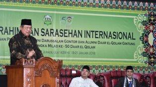 JAYANTI - Mantan Presiden Ke-6 Indonesia Susilo Bambang Yudhoyono (SBY), Menteri Agama Lukman Hakim Saifuddin dan Bupati Tangerang A Zaki Iskandar Bersama Ratusan Kiai Alumni Gontor Dan Daar El-Qolam menghadiri Sarasehan Pondok Pesantren Alumni Gontor dan Gintung. SBY yang hadir ke Pesantren Daar El Qolam sebagai pembicara dalam rangka Milad ke-50 pesantren terbesar di Provinsi Banten, di Pondok Pesantren Daar El Qolam, Kecamatan Jayanti, Kabupaten Tangerang, Sabtu (20/01/2018).