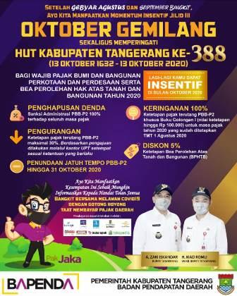 "Program ini kita mempertimbangkan karena Oktober ini bulan kebahagiaan masyarakat Kabupaten Tangerang, karena bulan ini adalah kelahiran Kabupaten Tangerang yang ke-388 tahun berdasarkan kajian yang terbaru. Oleh karena itu mari manfaatkan program Oktober Gemilang ini untuk memenuhi kewajiban perpajakannya baik PBB maupun BPHTB," ujar Zaki.