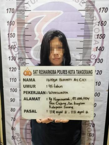 TIGARAKSA, (JT) - Seorang perempuan berinisial WBR (44) warga Kelurahan Kutabaru, Kecamatan Pasar Kemis, Kabupaten Tangerang, Banten, ditangkap personel Satuan Reserse Narkoba Polresta Tangerang, Polda Banten, Sabtu (18/9/2021).