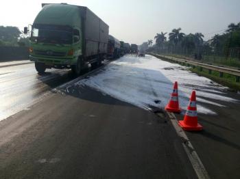 Berdasarkan pantauan dilapangan, akses jalan Tol - Merak mengalami macet total sepanjang puluhan kilometer dan jalur tol Merak sempat menggunakan sisten buka tutup karena BBM yang tercecer di tol tersebut membahayakan pengguna jalan.