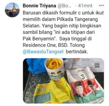 "Barusan dikasih formulir C untuk ikut memilih dalam Pilkada Tangerang Selatan. Yang bagiin nitip bingkisan sambil bilang "ini ada titipan dari Pak Benyamin". Saya tinggal di Residence One, BSD. Tolong @BawasluTangsel bertindak," ujar Bonnie dalam cuitannya tersebut.