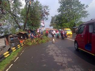 "Selain pohon tumbang, atap bengkel tambal ban juga rusak parah tertimpa pohon. Beruntung korban hanya mengalami luka-luka dalam kejadian ini," ujar Wawan, Waga Cibadak.