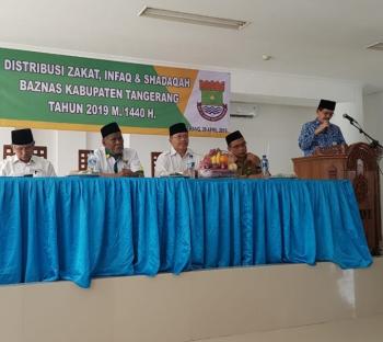 PANONGAN - Badan Amil Zakat Nasional (BAZNAS) Kabupaten Tangerang menyalurkan Zakat, Infak dan Shadaqah k epada ratusan warga Tangerang jelang Ramadhan tahun 2019 M/1440 H. ZIS disalurkan secara simbolis, di aula Islamic Center Tangerang Citra Raya, Kecamatan Panongan, Kabupaten Tangerang, Senin (29/4/2019).