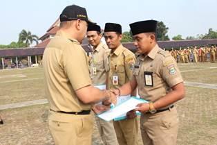 Setelah melakukan apel, Bupati Tangerang A. Zaki Iskandar menyerahkan Sk Kenaikann Pangkat Bagi PNS golongan II, Golongan III dan golongan IV dilapangan maulana yudha negara. (EPS)