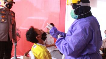 SERANG, (JT) - Guna mencegah penyebaran covid-19 pasca Idul Fitri, Polres Serang Kota, Polda Banten, menggelar pendisiplinan protokol kesehatan dan tes swab antigen di Gerbang Tol Serang Timur, Kamis (20/5/2021).