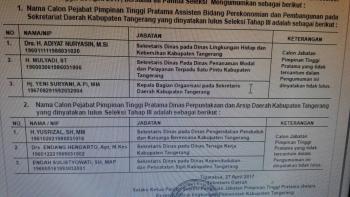 Dari data yang dihimpun, enam orang pejabat yang lolos masuk tiga besar seleksi tahap kedua pada formasi jabatan Kadis perpustakaan dan kearsipan adalah Endah Sulistyowati Sekdis kependudukan dan catatan sipil kabupaten Tangerang, Endang Hendarto Sekdis tenaga kerja dan Yusrizal Sekdis pengendalian kependudukan dan keluarga berencana Kabupaten Tangerang sedangkan untuk jabatan Asda II yang lolos seleksi tahap ke II adalah Secretaries Dinas Lingkungan Hidup Hadiyat Nuryasin, Kabag Organisasi Setda Yeni Suryani, dan Mulyadi Sekdis Penanaman modal dan pelayanan modal satu pintu Kabupaten Tangerang.