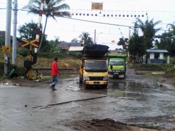SERANG - Jalur jalan Propinsi yang terbelah oleh palang pintu Kereta Api antara Desa Cemplang, Kecamatan Jawilan, Kabupaten Serang yang berbatasan langsung dengan Desa Mekarsari, Kecamatan Rangkasbitung rusak berat.