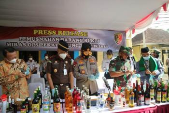 SERANG, (JT) - Jelang Natal 2021 dan Tahun Baru 2022 (Nataru), Polda Banten memusnahkan puluhan ribu botol minuman keras (miras) yang merupakan hasil operasi pekat maung 2021, Kamis (23/12/2021).