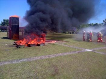 Terlihat Satuan Damkar menunjukan keahlianya dalam melakukan simulasi pemadaman api. Sejumlah petugas pemadam kebakaran memperagakan pemadaman api. Dalam motonya, pemadam kebakaran bertekad untuk berjuang dalam melawan kobaran api dengan slogan pantang pulang sebelum api padam. (day)