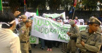 SERANG-Puluhan pelajar yang mengatasnamakan Pelajar Islam Indonesia (PII) Provinsi Banten memenggelar unjuk rasa di Halaman Kantor Dinas Pendidikan Kawasan Pusat Pemerintah Provinsi Banten, (KP3B) pada Rabu (2/5/2017). Aksi damai ini bertepatan dengan Hari Pendidikan yang jatuh pada 2 Mei. pada aksinya mereka membawa sejumlah spanduk dan tuntutan.