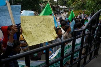 TANGERANG – Sedikitnya 60 pelajar yang tergabung dalam Pelajar Islam Indonesia (PII) menggelar aksi unjuk rasa di depan halaman Pusat Pemerintahan Kota Tangerang, Rabu (30/12). Mereka menolak perayaan tahun baru masehi bagi umat Islam di Kota Tangerang.