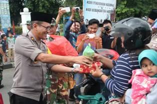 LEBAK - Bulan Suci Ramadhan berbagai pihak berlomba-lomba berbagi kebahagiaan. Seperti halnya Kepolisian Resort Lebak Polda Banten bekerjasama dengan Kodim 0603/Lebak membagikan takjil kepada masyarakat yang melintasi kawasan alun-alun Rangkasbitung, Jum'at, (10/5/2019).