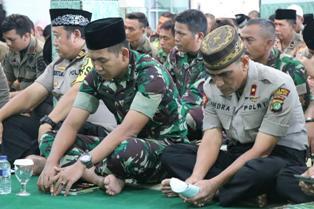 TANGERANG - Ratusan prajurit TNI dan personel Polri mengikuti doa bersama dengan anggota Satpol PP, agar pelaksanaan Pemilihan Umum (Pemilu) serentak 2019 berjalan aman dan damai. Doa bersama ini digelar di Masjid Al-Kautsar Polrestro Tangerang, Banten.