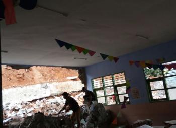 SERPONG - Peristiwa longsornya turab setinggi 12 meter yang mengakibatkan empat ruang kelas di SMP N 19 Tangsel tertimbun langsung beri garis polisi.