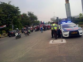 Sementara berbagai elemen serikat buruh mulai memadati akses jalan Raya Serang, dengan mengendarai kendaraan roda dua dan empat, buruh mulai berangkat menuju kantor Gubernur Banten di Serang. (day)