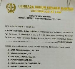 Kepada jurnalatangerang.co, Ichsan Sodikin mengaku sudah menyiapkan enam orang pengacara yakni Aris Purnomohadi, Joko Nurwanto, Sri Nurlita Sari, Pipit Pidiansari, Mochamad Rifal Tanjung dan Andre Elfandes selaku kuasa hukum. Para pengacara yang tergabung dalam Lembaga Hukum Swadek Banten ini, sudah siap melayangkan gugatan hukum lantaran surat kuasa sudah ditandatangani.