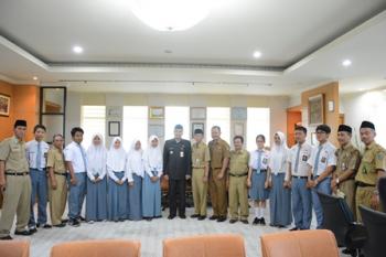 TIGARAKSA - Bupati Tangerang A Zaki Iskandar menerima kunjungan 10 anggota tim Lomba Cerdas Cermat (LCC) MPR Empat Pilar Kehidupan Berbangsa dan Bernegara tingkat nasional Tahun 2016. Para tim LCC MPR asal SMAN 3 Kabupaten Tangerang ini diterima di ruang kerja Bupati Tangerang, sekitar pukul 09.00 WIB, Senin (1/8 2016).
