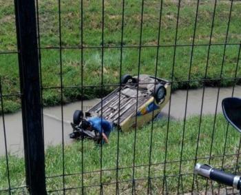 “Kecelakaan tunggal out of control, kendaraan terbalik ke sungai di samping Parimeter Selatan. Pagar pembatas mengalami kerusakan,” ujarnya.