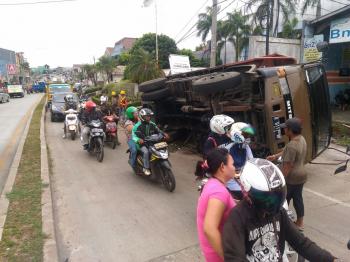 PAMULANG - Truk nomor polisi B 9117 MF terjungkal di Jalan Raya Siliwangi, Kecamatan Pamulang, Kota Tangsel, pada Jumat (13/1/2017) siang. Akibat insiden tersebut arus lalu lintas dari Pamulang ke arah Ciputat mengalami kemacetan parah.