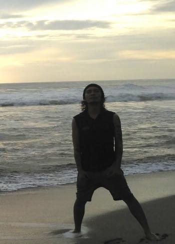 RANGKASBITUNG - Sosok Ahmad Afandi alias Andi Babas (37) salah seorang personil grup musik cadas Boomerang asal Kota Surabaya sambangi destinasi wisata Pantai Pasir Putih, Kecamatan Cihara, Kabupaten Lebak.