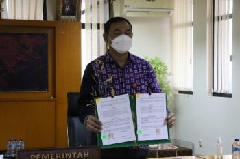 TIGARAKSA, (JT) - Wakil Bupati Tangerang H. Mad Romli didampingi Kepala BKPSDM Hendar Herawan menandatangani nota kesepahaman penempatan lulusan Politekni Keuangan Negara (PKN) STAN Tahun 2021 secara virtual. Rapat digelar di Ruang Rapat Cituis Lt. 5 Gd. Kantor Bupati Tangerang, Kamis (21/10/2021).