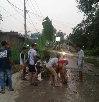 Terlihat puluhan warga beramai-ramai membawa pohon pisang dan cangkul di jalan tersebut. Belasan pohon pisang ditancapkan di jalan aspal yang kini sudah bercampur batu dan kerikil tajam itu.